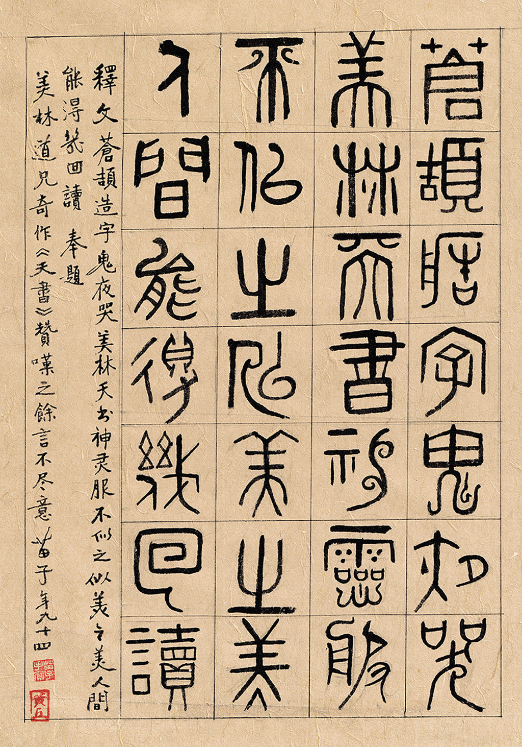 《天书》是一部文字学的大书。美林首次收集了远古时代失散于各处的古文字,并诉诸于书法。这使得《天书》首先是一部古文字的图录。它书录的古文字超越万字。洋洋大观地展示华夏先民无穷的文化创造力。美林好似把我们带到五千年中华文明的源头。站在此处,放眼一看,千千万万形形色色的古文字,如大海浪花,闪烁无涯。