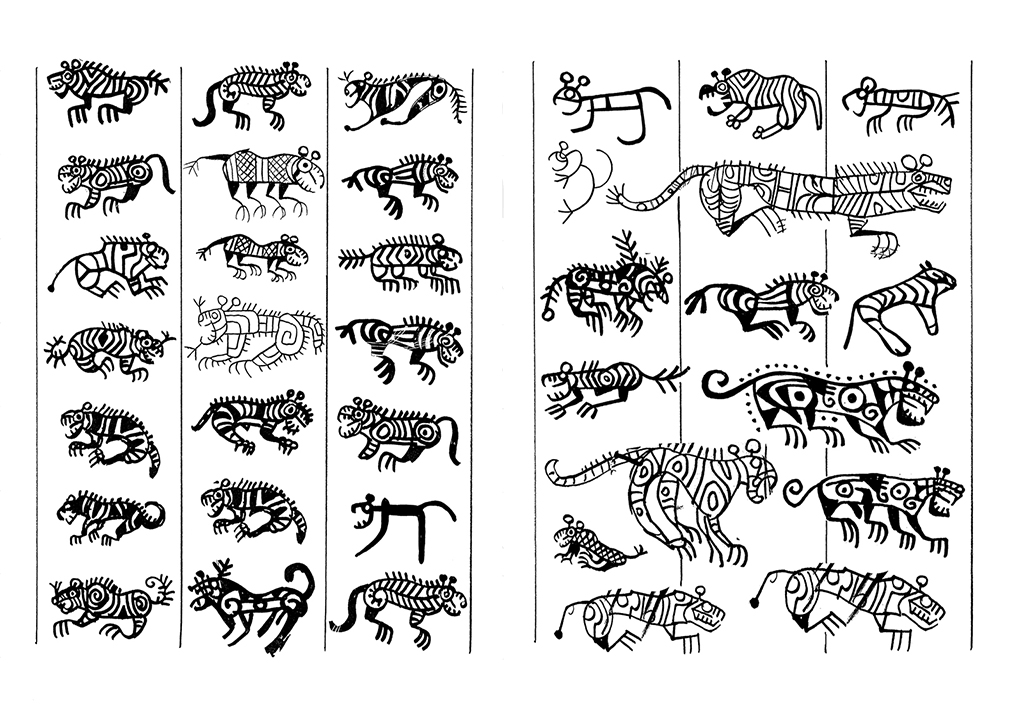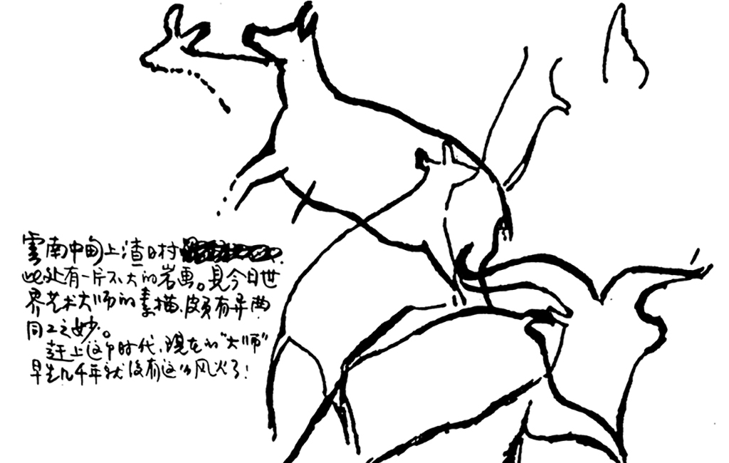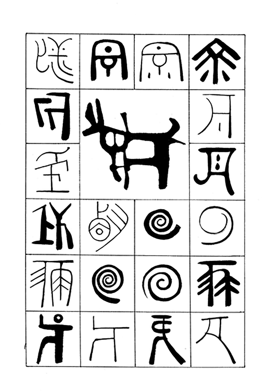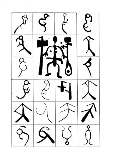 在搜集那些古文字遗存时,我也开始搜集岩画,它们是不是文字或就是图画,我虽没加入探讨和热谈,但是我却把它们当成象形文字和记事的图画连捎加带搜集了不少,同时将它转化成“形象”,真是收益不少。为此,在文字图画尚未定夺之前,我也画了一些可参考的岩画形象放在页中,这样看起来不会枯燥。因为这本书不是古文字考证的书,也就不计较它们的去留和前后。