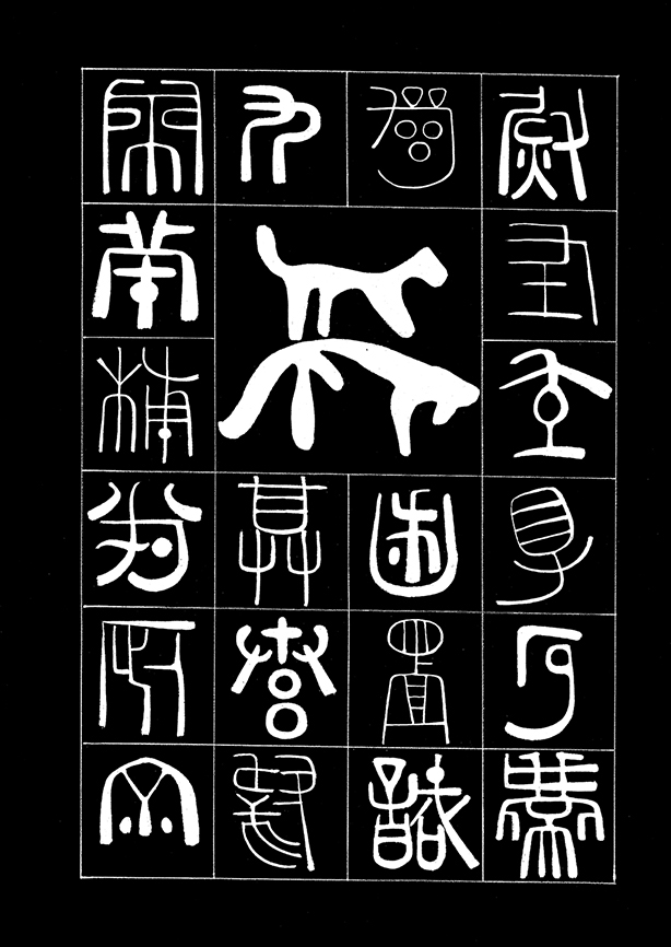 我一再申明,因为是第一接触,我把篆字当成了“图画”,所以从我决定一生走美术道路起,篆书在我眼中也就走了“味”,它跟我走的不是书法路,加之后来我的兴趣又扩大的原因(甲骨、汉简、岩画、古陶文和一些符号、记号),它们在我眼里都没有以书法对待,而是成了根深蒂固的 “形象”。