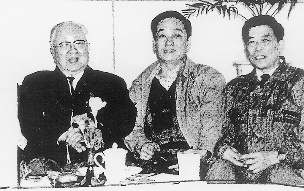 1985年,韩美林与启功老师、田凤利在香港。启功老师为“天书”找了个好去处——“收容所”,以后,老田也成了这本“天书”的传递“大使”。