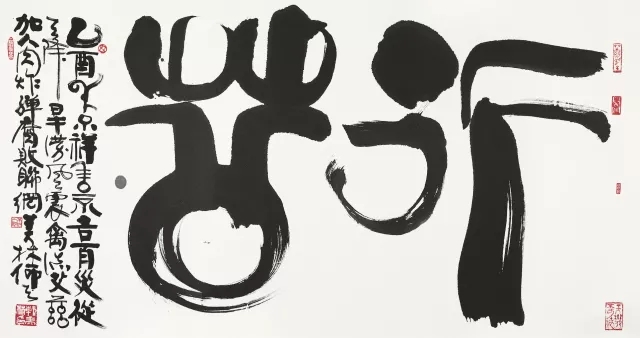 这种美来自他的气质。凝重、雄劲、率真、自由和不竭的激情。他的天性气质与古文字原有的气质是不是有些相近和相通?反正我已经说不好到底是古文字对他影响的多,还是他的艺术个性参与的多?