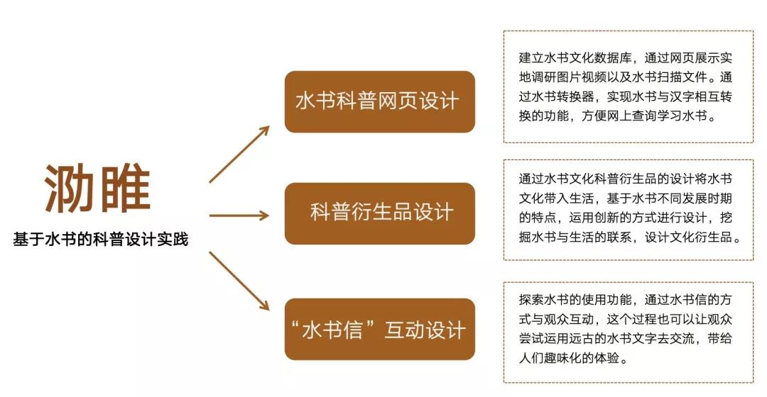 我结合视觉传达设计专业进行思考,将“泐睢”科普网页、科普衍生品、“水书信‘互动设计三个主要内容组成一个较为完整的体系,形成“泐睢”品牌,建立水书与生活的联系,用创新的方式传承水书文化。