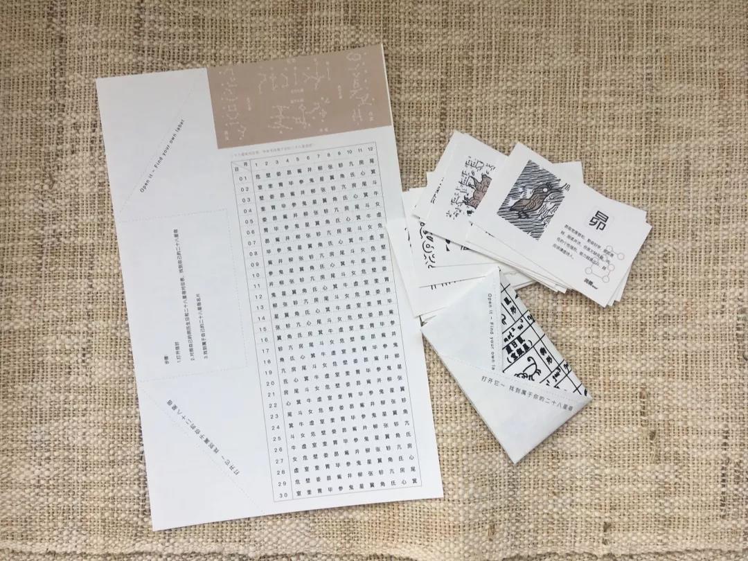水书中的二十八星宿是图画文字呈现一种自由的稚拙的童真的美感,我希望在设计中保持水书的这种原始风格,并结合现代的抽象画进行创作,设计新的水书·二十八星宿插画。结合二十八星宿的文化内涵,设计可以让观众与产品有互动感的衍生品。